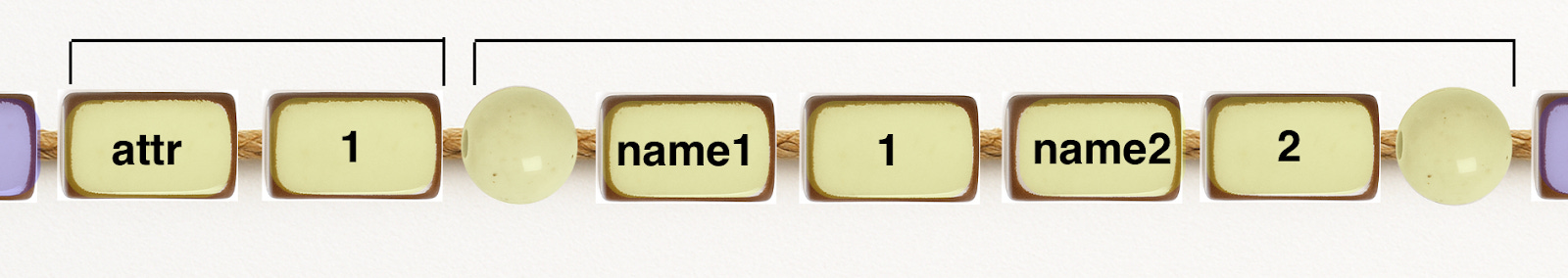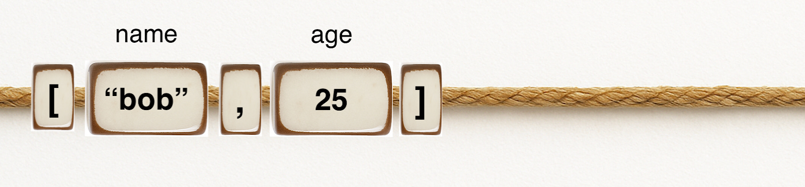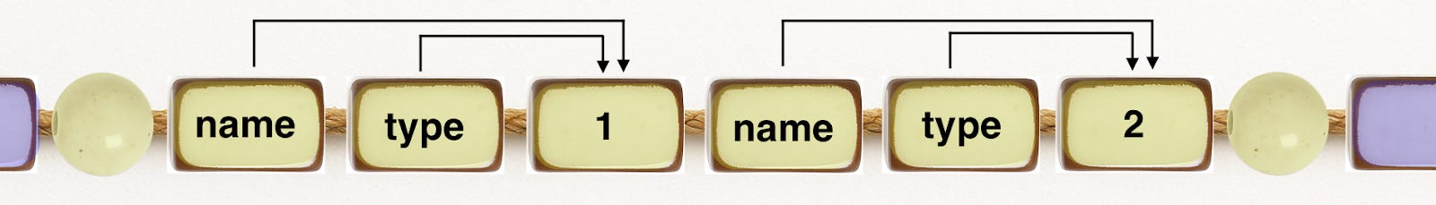 This Object clearly has an order once the beads are put on the twine. We’re not able to change values, and we can’t create new dimensions or add twine in different directions. It also has a start and an end. We’ve defined special tokens that signal the start and end of a block. The format doesn’t provide any flexibility beyond adding additional fields and values between the start and end of the block.